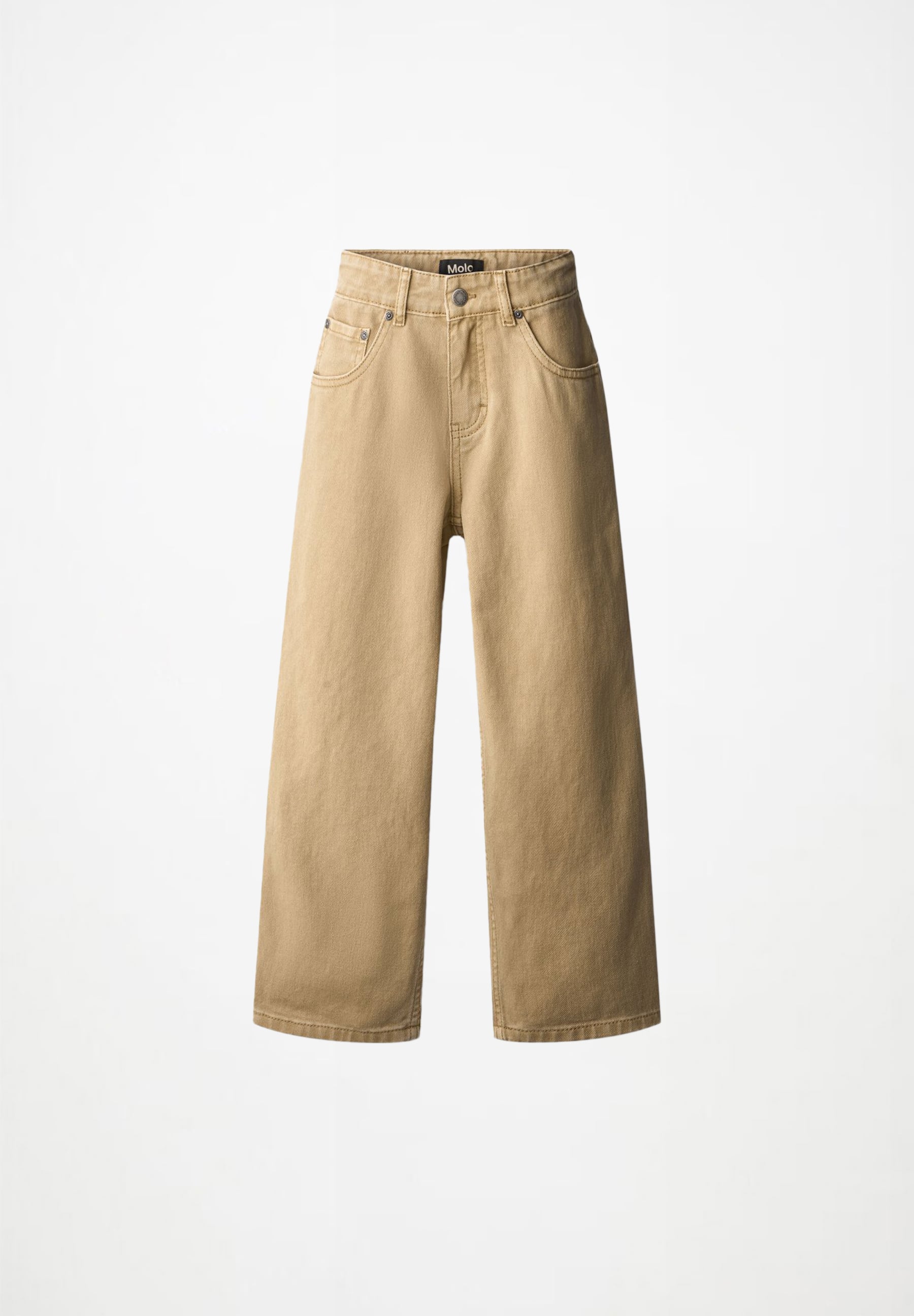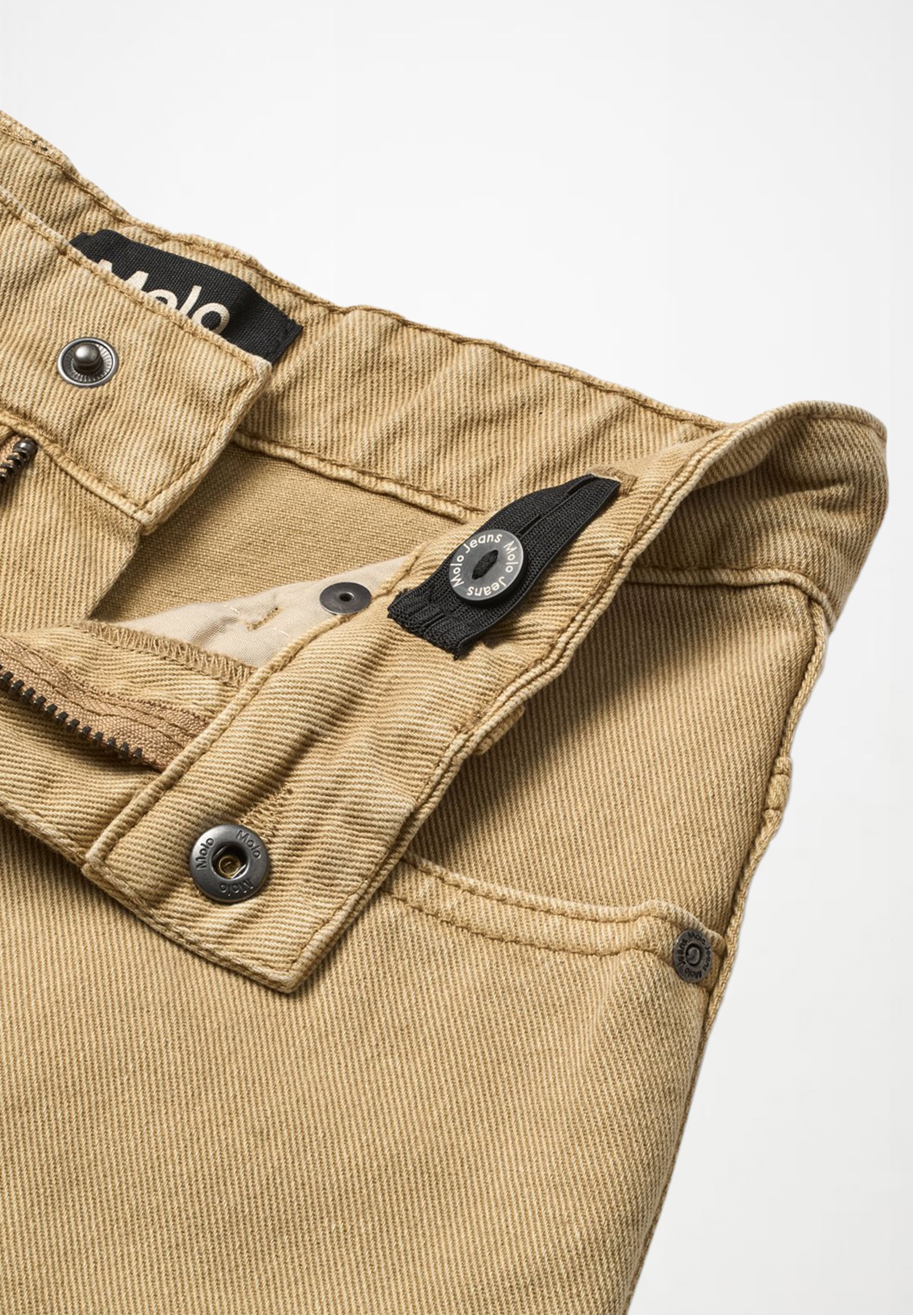 Джинсы Molo для мальчика. Бежевые джинсы из хлопка. У джинсов 5 карманов, прямые штанины, ширинка на молнии и свободный крой с регулируемой резинкой на талии. В самых маленьких размерах (92–134) есть кнопка, а в размерах 140–176 — классическая джинсовая пуговица. Состав: 100% хлопок.