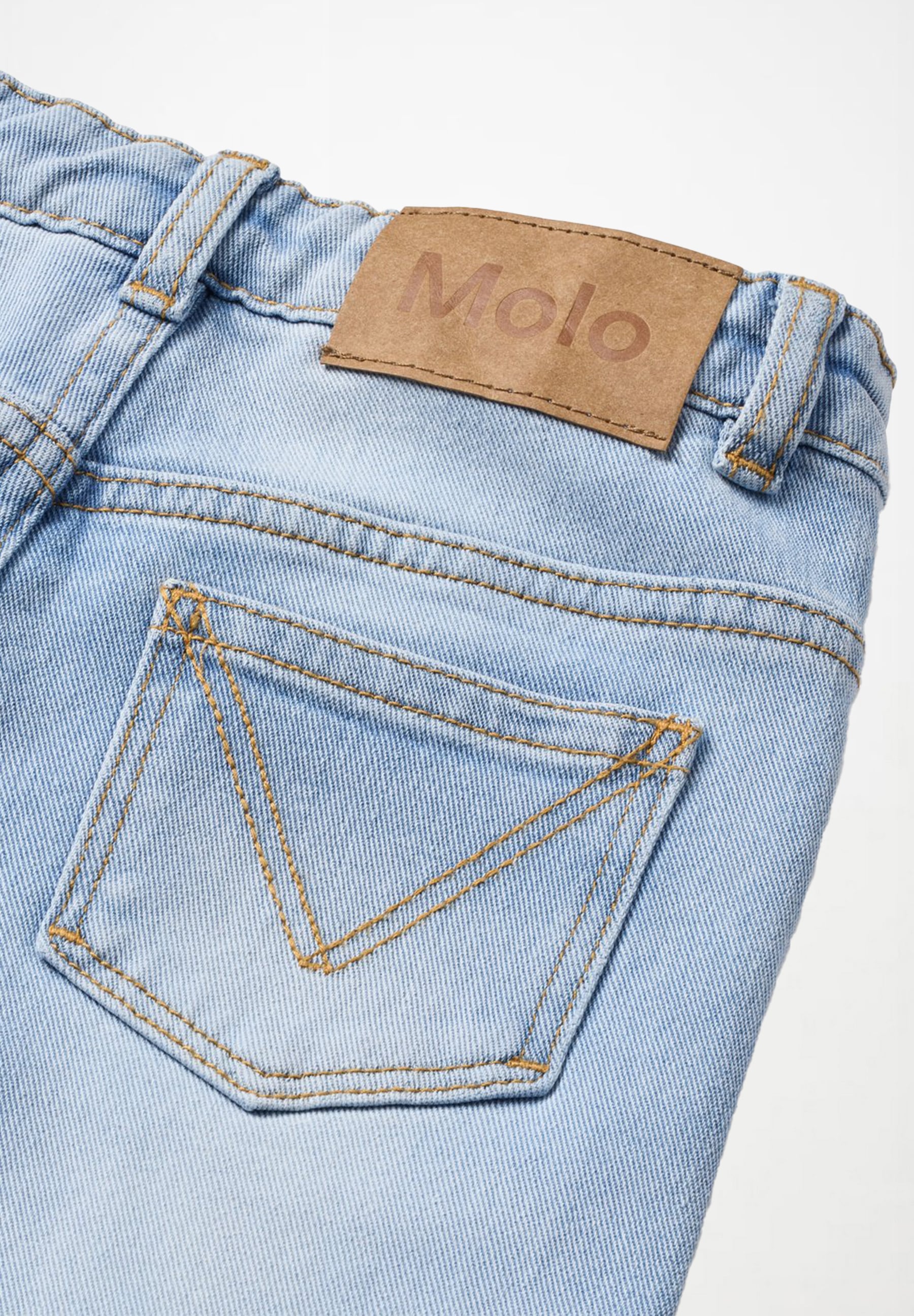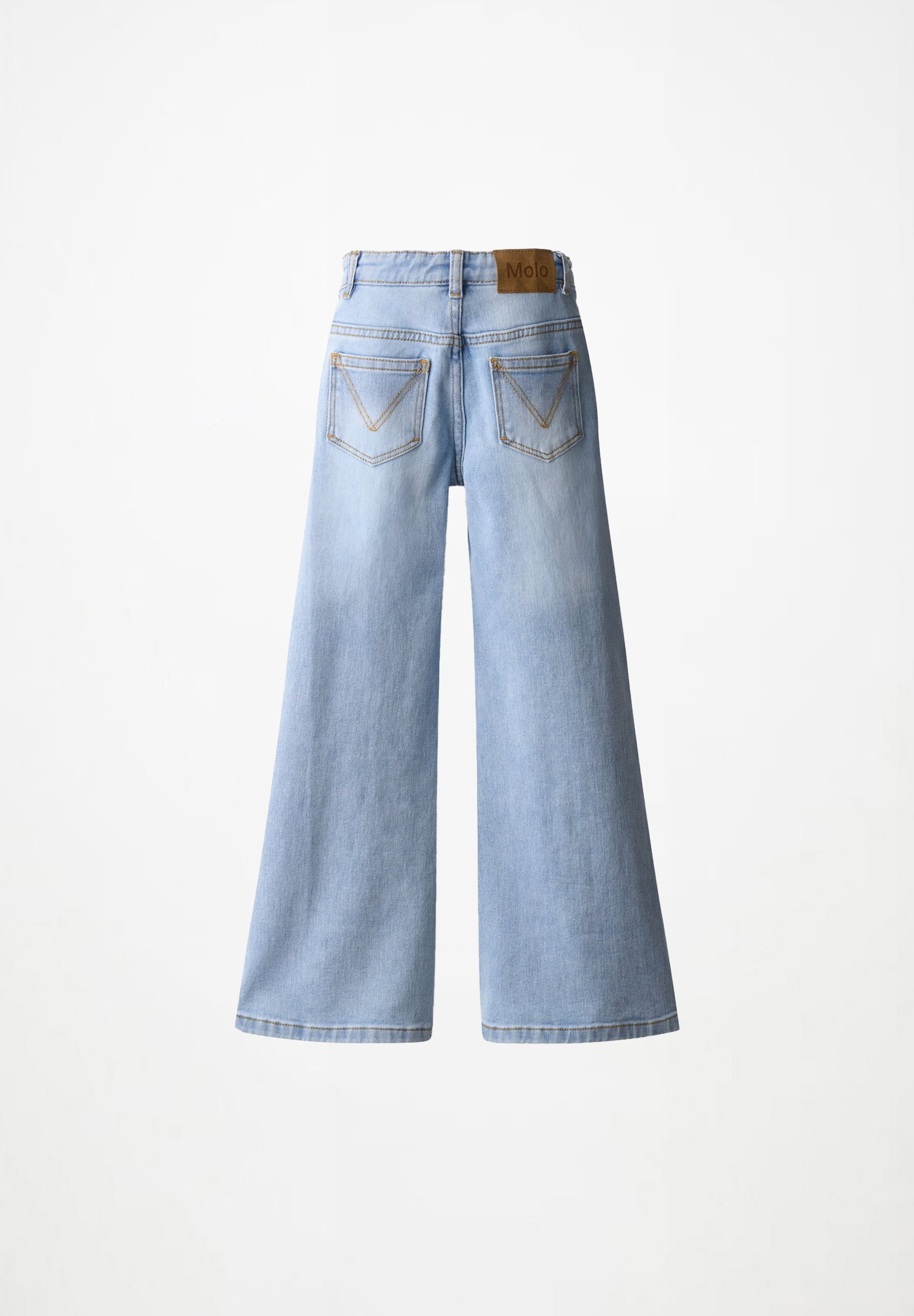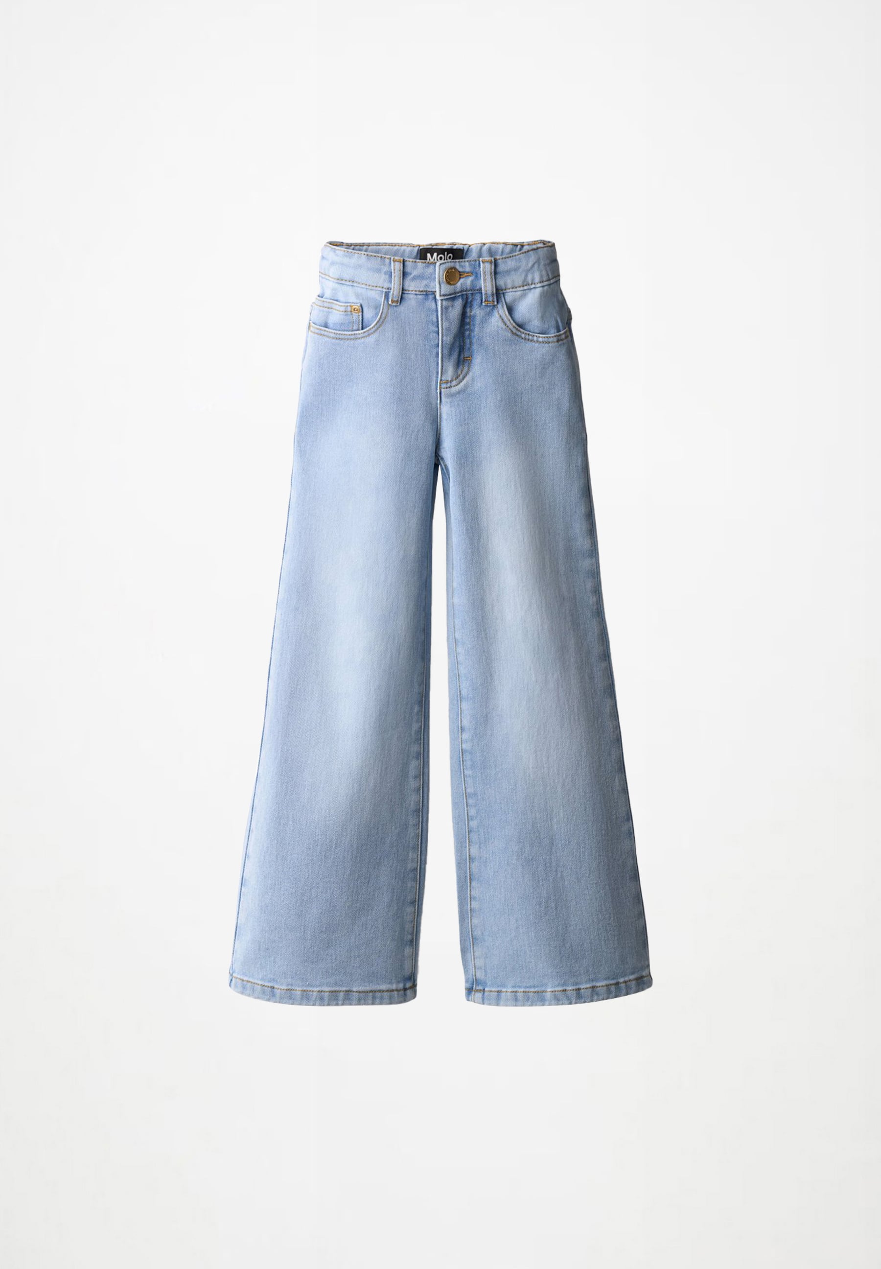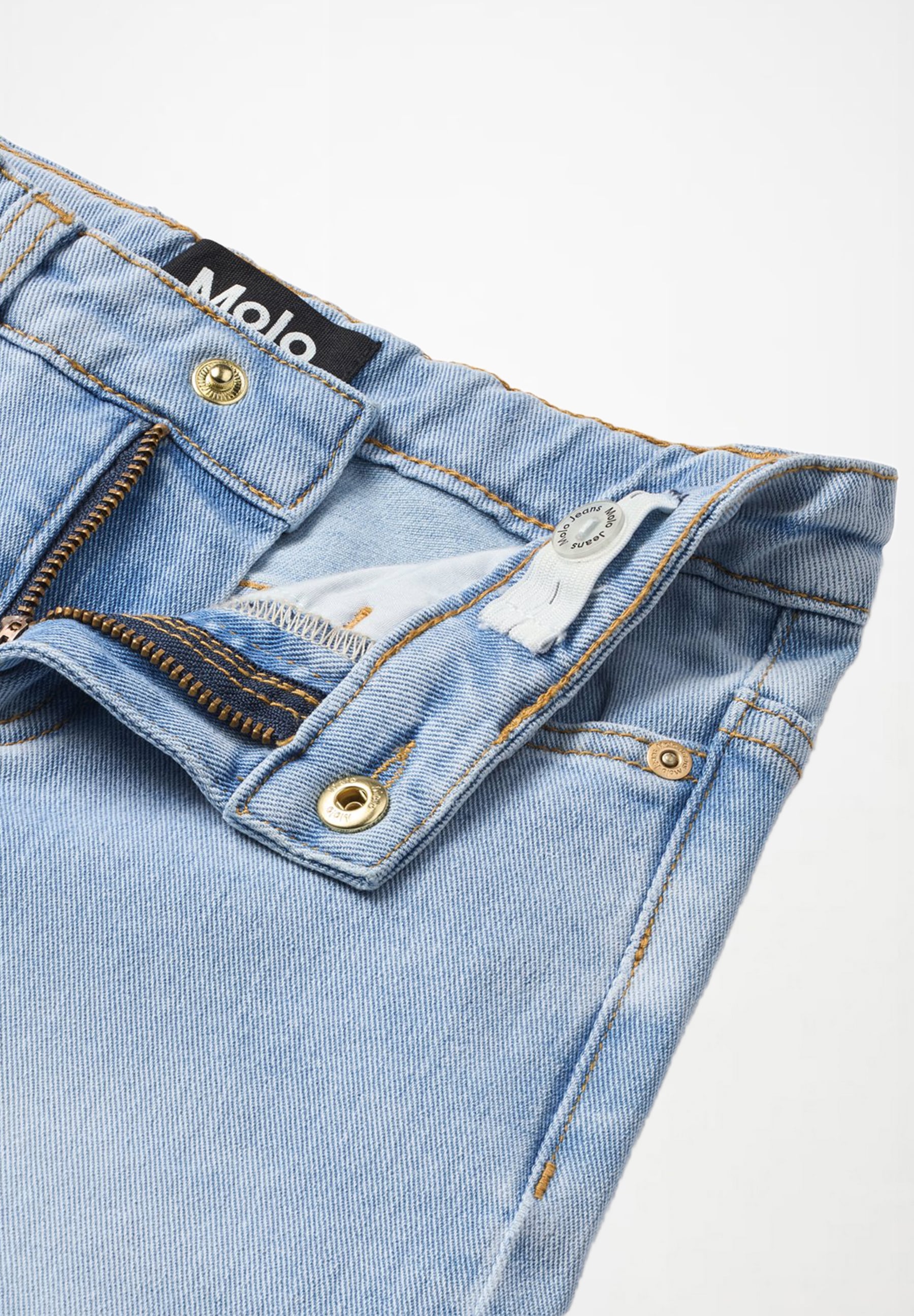 Джинсы Molo для девочки. Светло-голубые джинсы из эластичного органического хлопка. Джинсы классического кроя с пятью карманами, элегантной расклешенной формы и прямого силуэта. Пояс легко регулируется с помощью внутренней резинки, поэтому брюки идеально сидят на любой фигуре. В размерах 92–134 предусмотрена практичная кнопка, а в размерах 140–176 — традиционная пуговица. Состав: 75% натуральный хлопок, 22% полиэстер, 2% вискоза, 1% эластан.