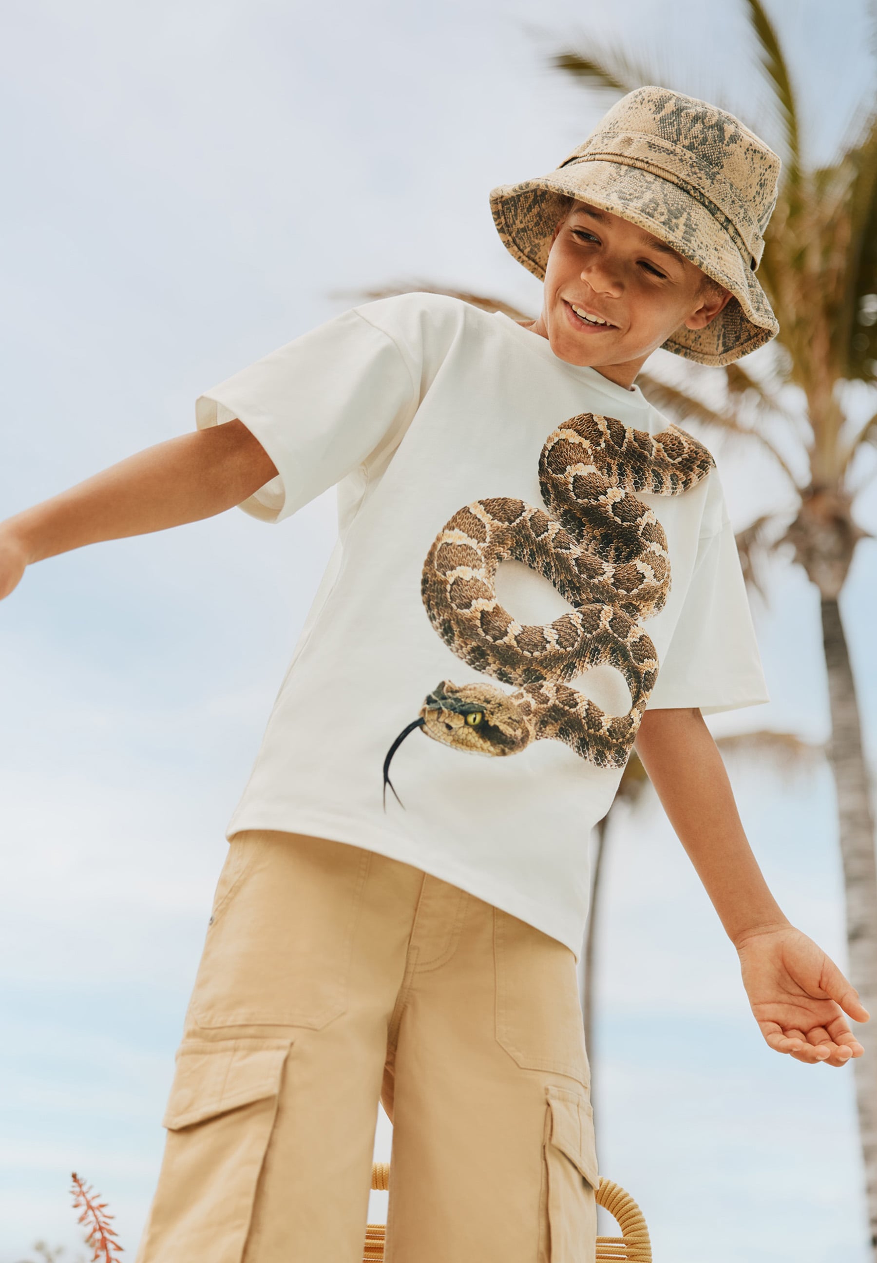 Детская бежевая панама Molo. Выполнена из хлопка с добавлением вискозы с принтом в виде змеи. Шляпа прямого кроя с вентиляционными отверстиями представлена в трех размерах и идеально подходит для пляжа и бассейна. Состав: 90% хлопок, 10% вискоза.