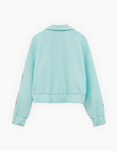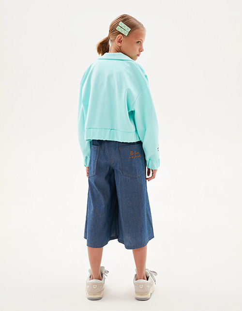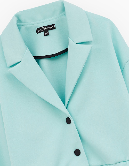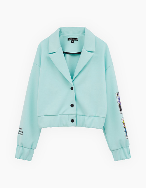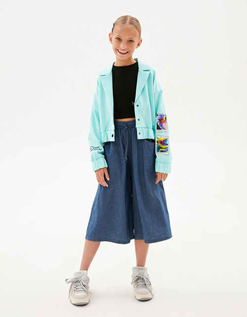 Жакет-бомбер в освежающем оттенке морской бриз от BellBimbo для девочки. Прямая укороченная модель. Спущенная линия плеча. Манжеты и низ изделия на мягкой резинке. Застёжка на контрастные кнопки. Жакет декорирован авторскими принтами, устойчивая DTF-печать. Состав: 64% вискоза, 32% нейлон, 4% эластан.