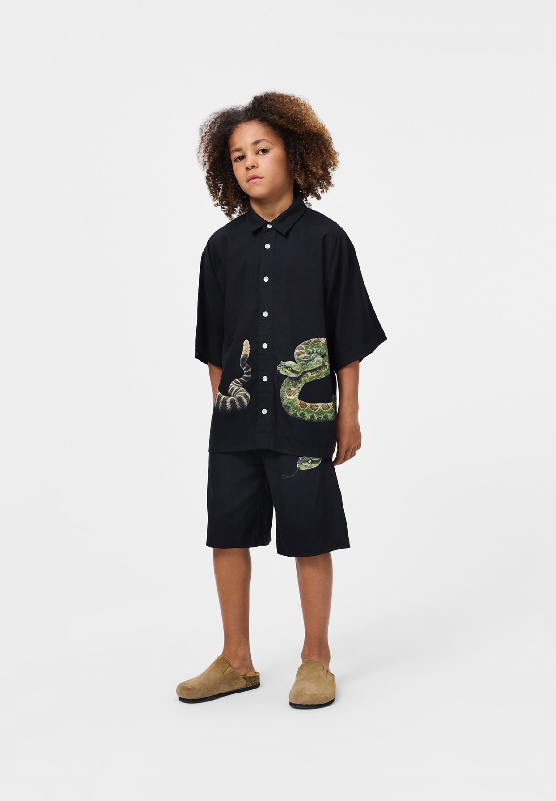 Шорты Molo для мальчика. Черные шорты из мягкой вискозы с принтом гремучей змеи. Эластичный пояс на кулиске, боковые карманы и свободный удобный крой — идеальный вариант для теплых летних дней. Состав: 100% вискоза.