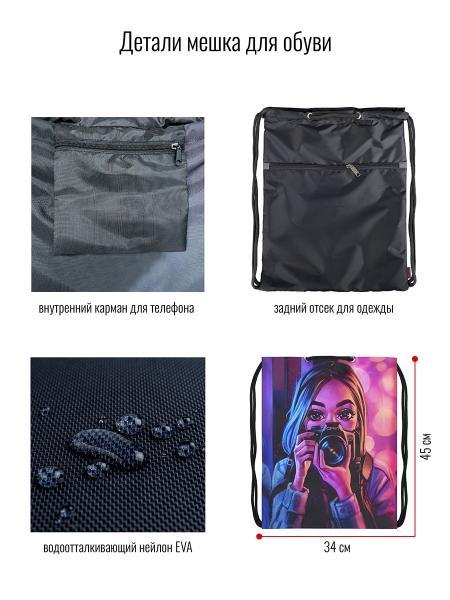 Мешок-рюкзак для сменной обуви от российского бренда BagRio отлично подойдет для хранения сменной обуви, для спортивной формы или прогулок. Мешок имеет размеры 45х34 см. Выполнен из качественного влагоустойчивого материала и имеет длительный срок службы. Модель имеет яркую расцветку, устойчивую к частым стиркам (не выцветает). Основное отделение затягивается толстыми шнуром, которые дополнительно выполняют функцию лямок, внешний карман застегивается на молнию. Мешок имеет внутренний карман на молнии для мелочей и телефона. Мешок-рюкзак удобно носить на плече или как рюкзак на спине, а также за ручку. Для безопасного использования в любое время суток, мешок дополнен светоотражающими элементами, которые обеспечивает безопасность в условиях недостаточного освещения, сделают его видимым на дорогах в свете автомобильных фар. Подростковые мешки для обуви бренда BagRio с модными принтами составят комплект к школьным ранцам и пеналам.