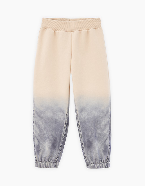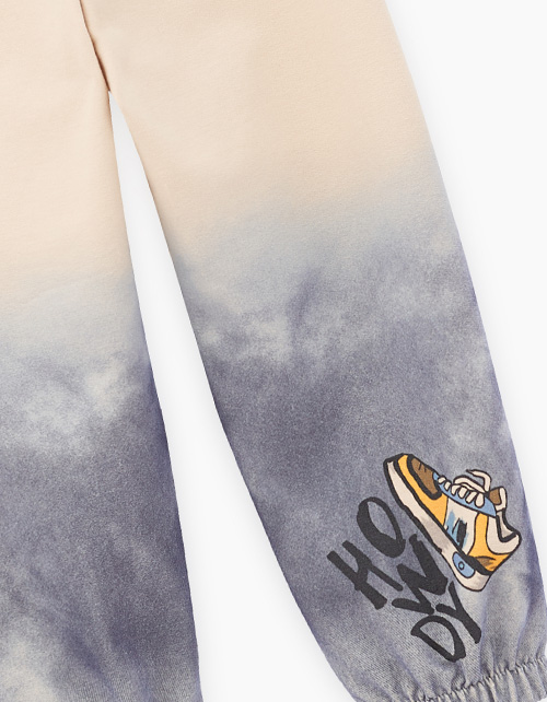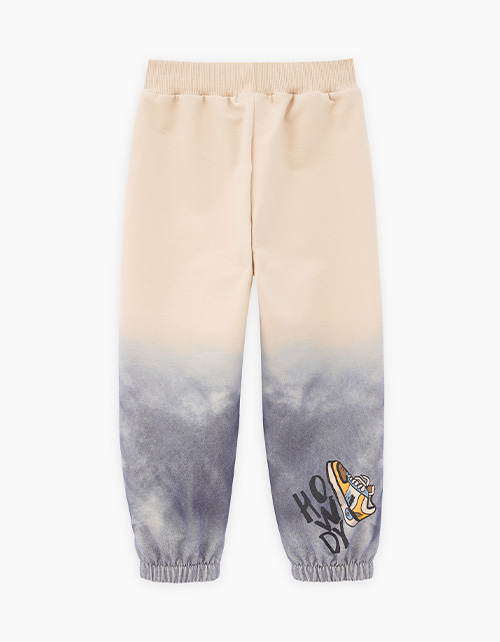 Комфортные брюки-джоггеры светло-бежевого оттенка от BellBimbo для мальчика. Прямая объёмная модель, со средней посадкой. Мягкий эластичный пояс и манжеты. Брюки из тактильно приятного футера. Оригинальный авторский принт. Состав: 96% хлопок, 4% эластан.