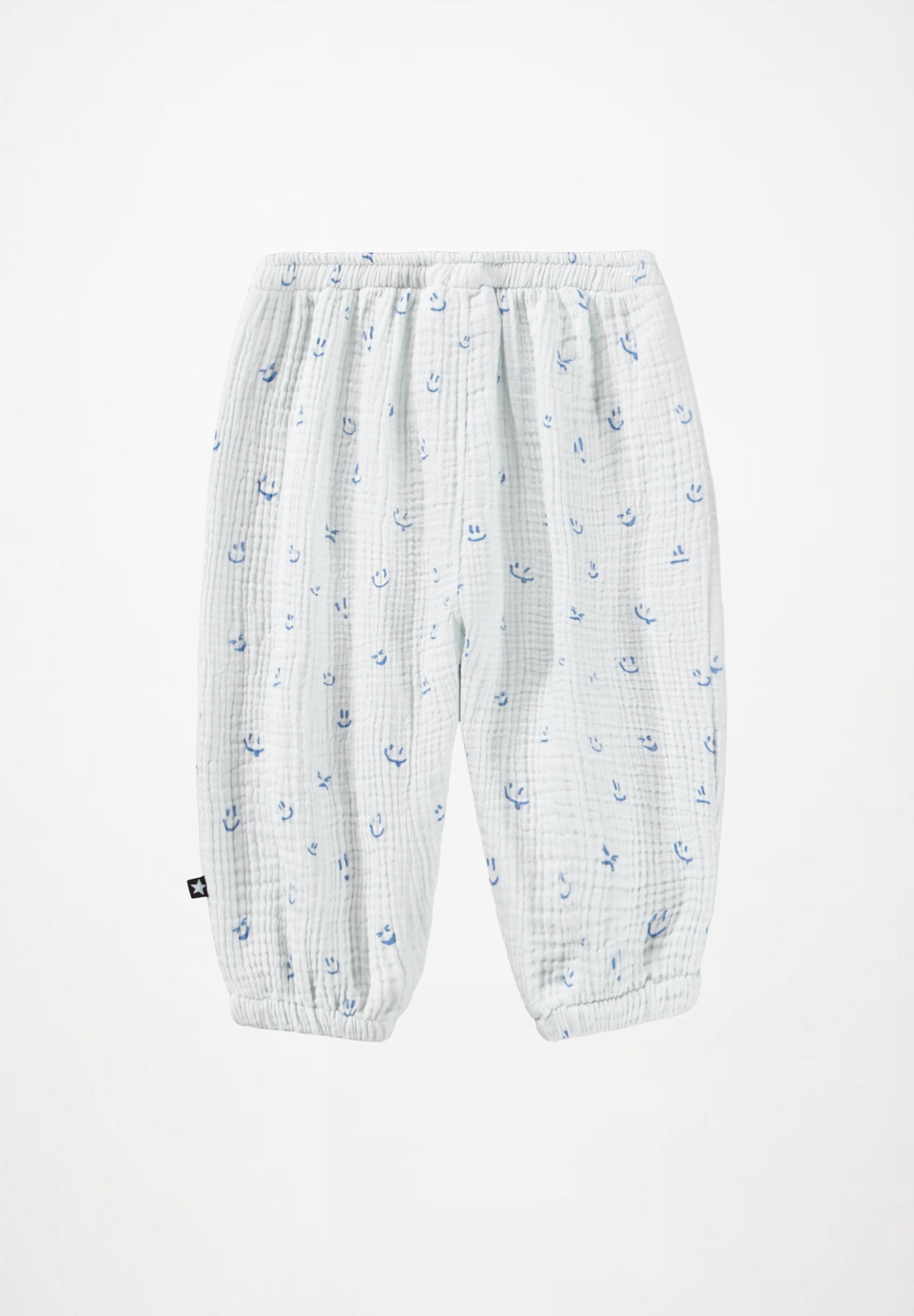 Брюки трикотажные Molo для девочки. Голубые трикотажные брюки для самых маленьких из органического хлопка с веселым принтом. Свободный крой, эластичная талия и резинка на щиколотках позволяют легко надевать и снимать брюки. Легкие и удобные брюки идеально подходят для повседневной носки. Состав: 100% натуральный хлопок.