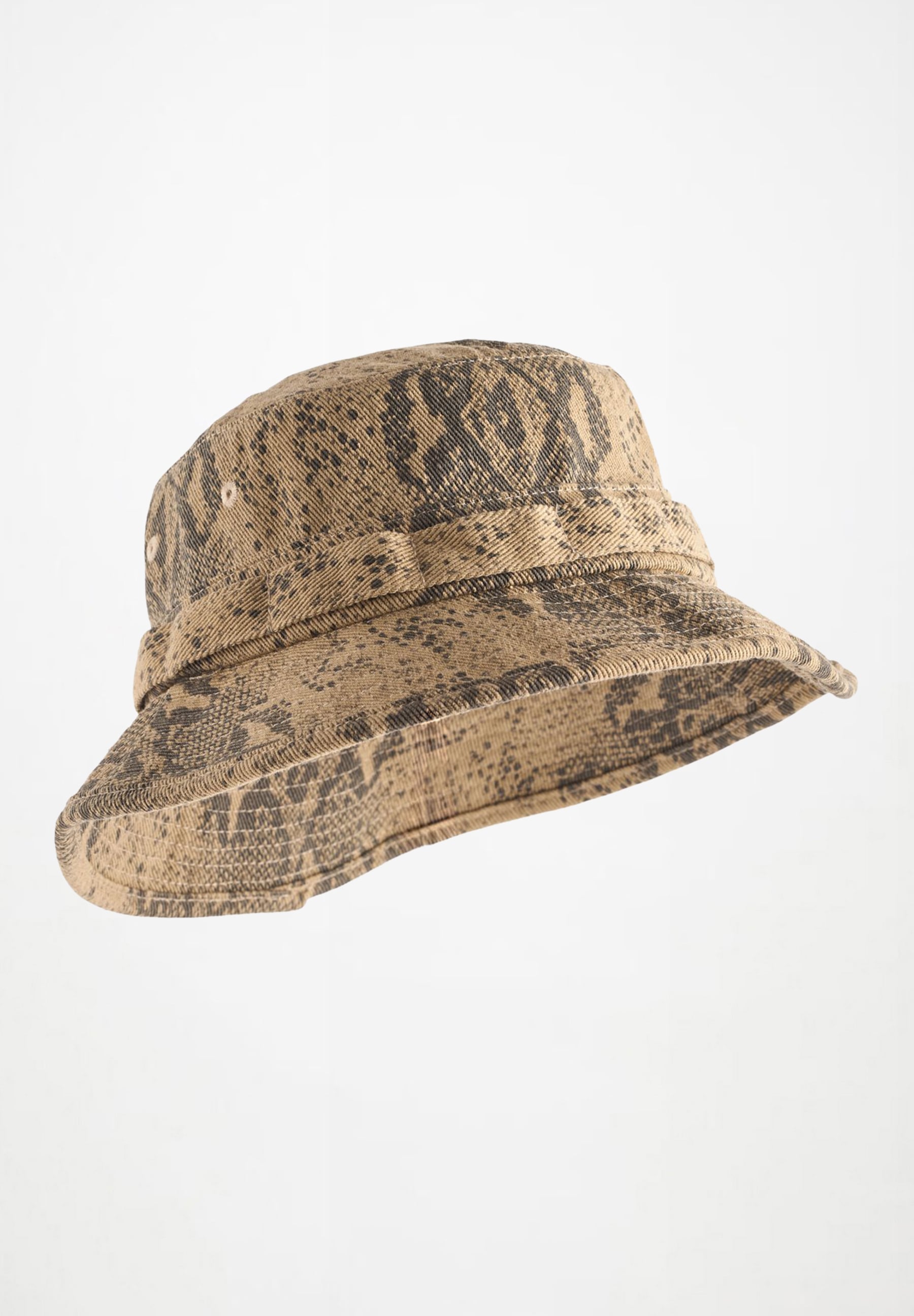 Детская бежевая панама Molo. Выполнена из хлопка с добавлением вискозы с принтом в виде змеи. Шляпа прямого кроя с вентиляционными отверстиями представлена в трех размерах и идеально подходит для пляжа и бассейна. Состав: 90% хлопок, 10% вискоза.