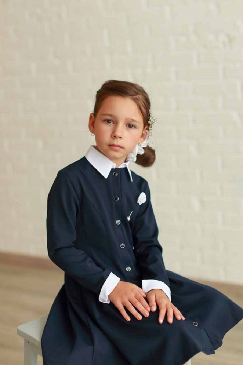 Школьное платье для девочки черного цвета. Приталенного силуэта и с расклешённой юбкой, сквозная застёжка на пуговицы. Декорировно съёмной булавкой-брошью с цветком. У платья съёмный воротник и манжеты. Состав: 65% вискоза, 35% полиэстер.