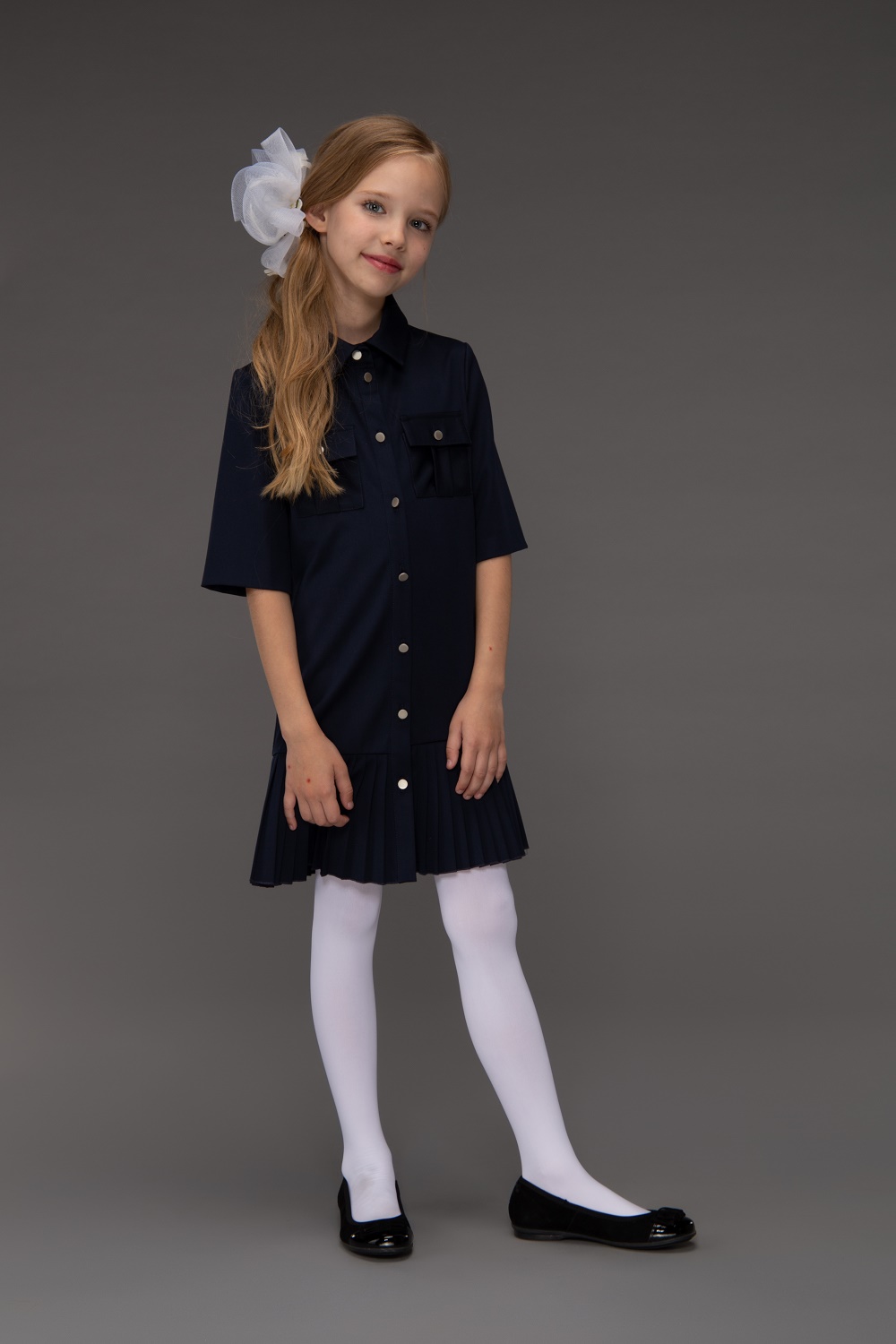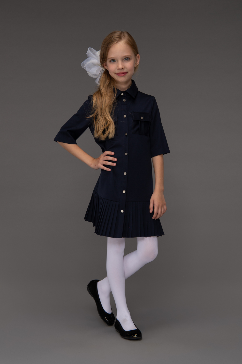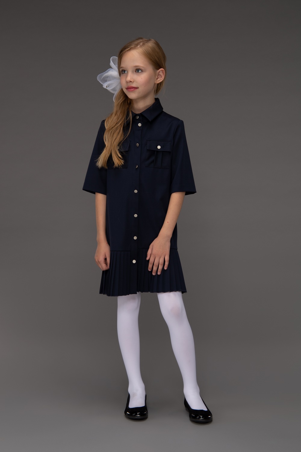 Стильное платье темно-синего цвета для девочки-подростка. Прямого силуэта, с накладными карманами, сквозная застёжка на пуговицы. Низ платья декорирован плиссированной оборкой. Удобного кроя, длина рукава 3/4. Можно носить с водолазкой.